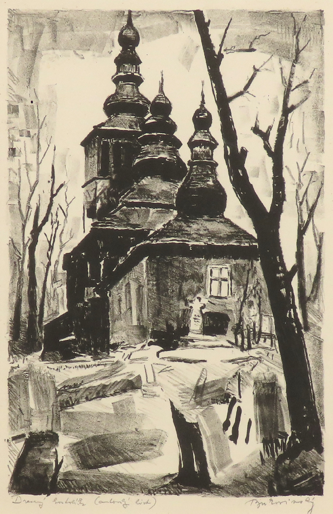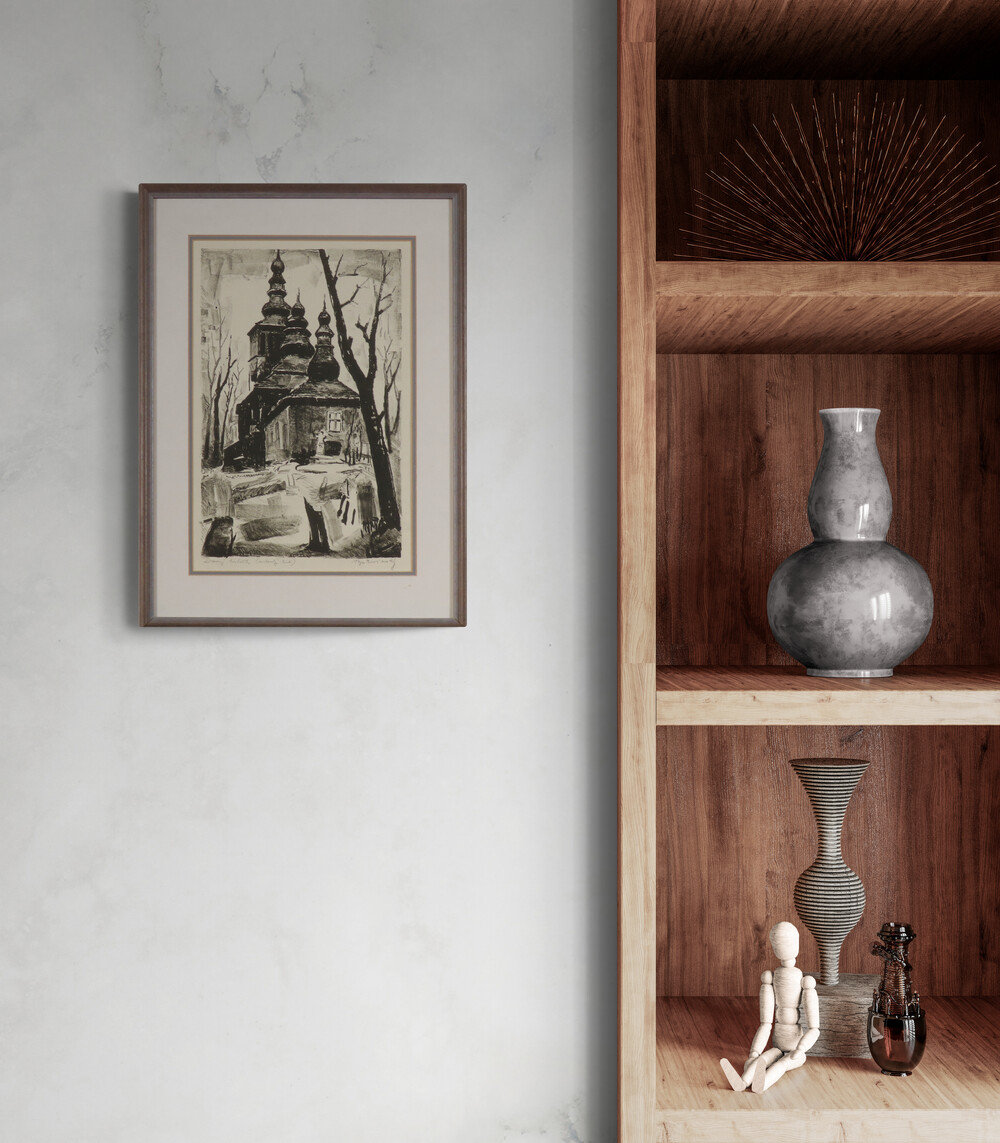 Názov diela: Drevený kostolík Technika: autorský list Značenie: vpravo dole Rozmery: 37,5 x 24 cm, rozmer s rámom: 51 x 36,5 cm