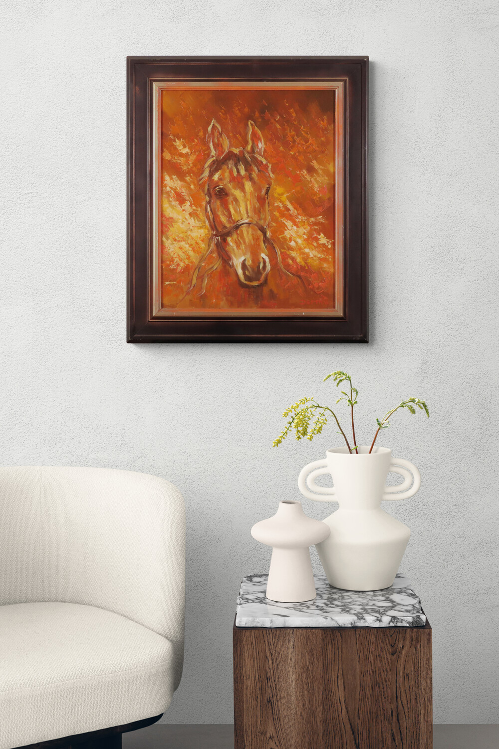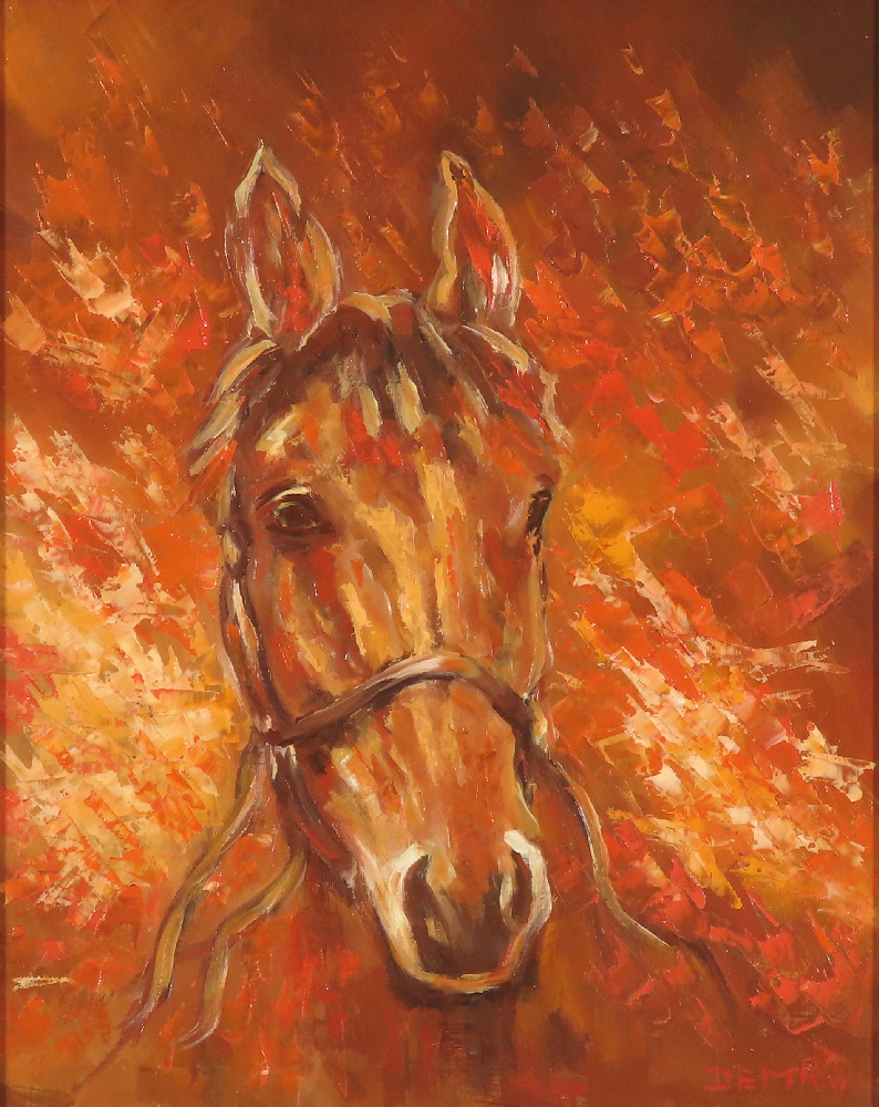Názov diela: Kôň Technika: olej na sololite Značenie: vpravo dole Rozmery: 50 x 40 cm, rozmer s rámom: 64,5 x 54,5 cm