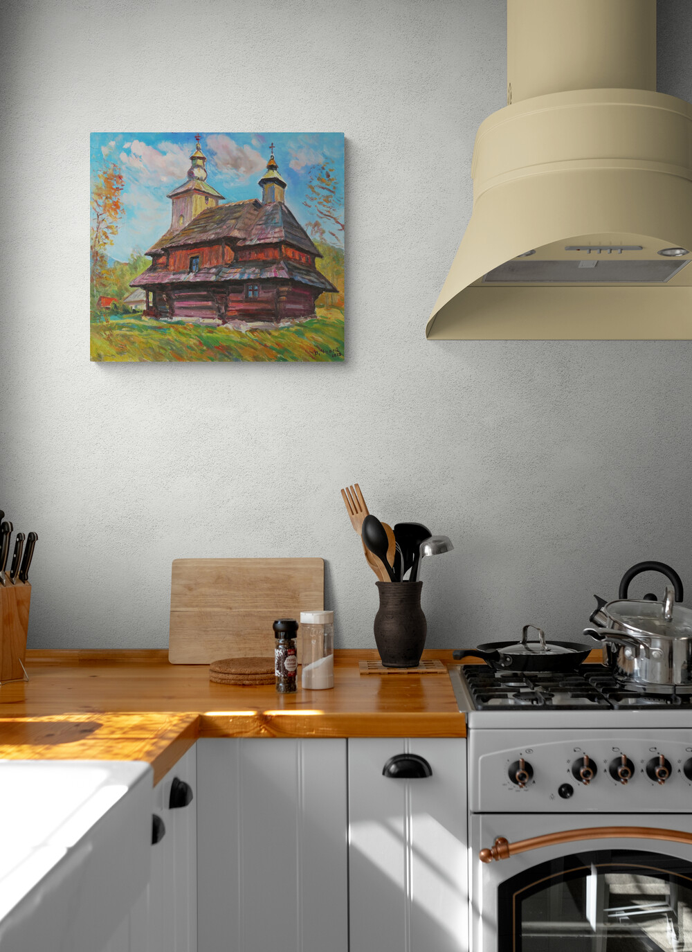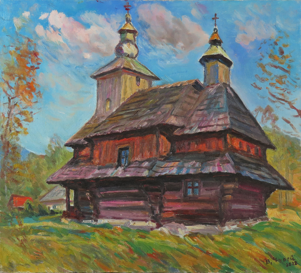 Názov diela: Drevený kostol Technika: olej na plátne Rok: 2022 Značenie: vpravo dole Rozmery: 55 x 61 cm