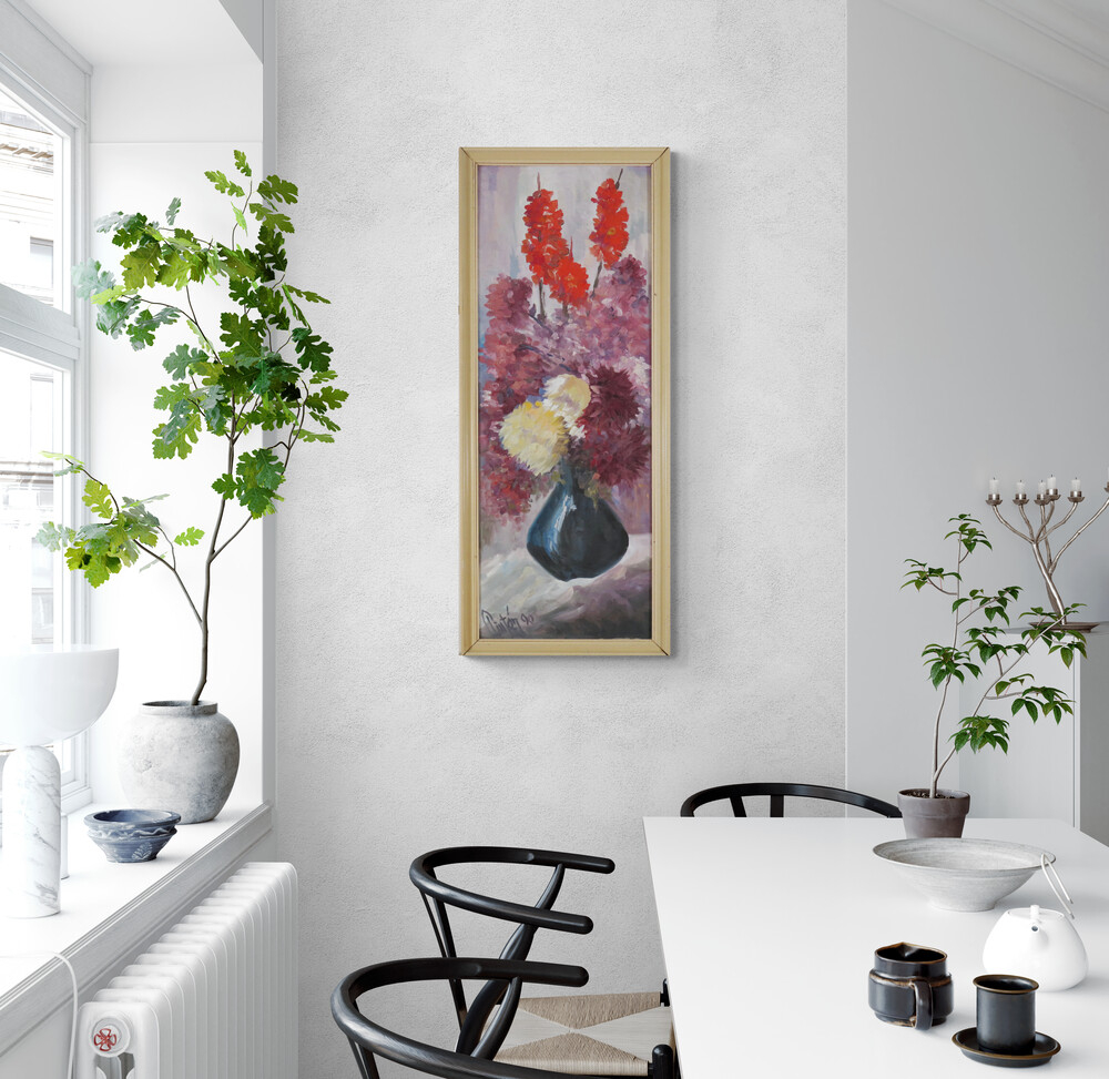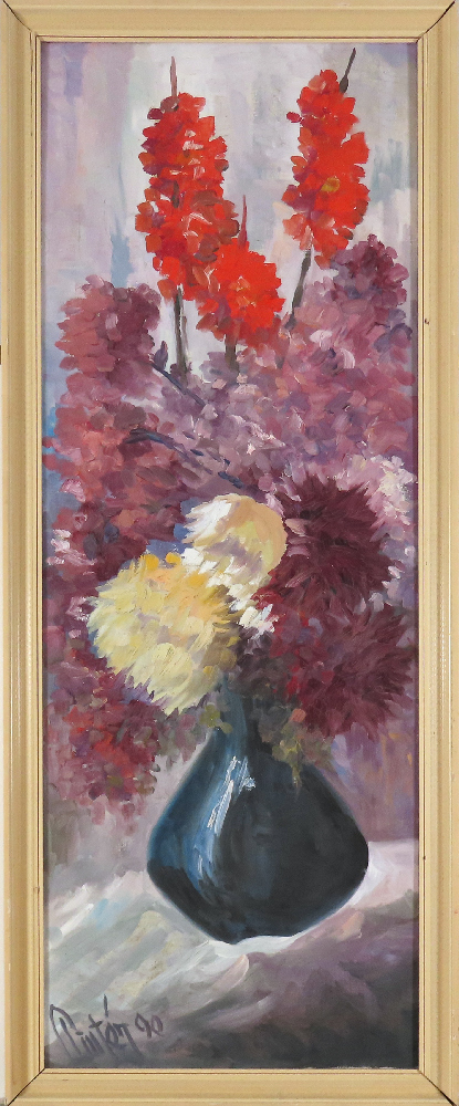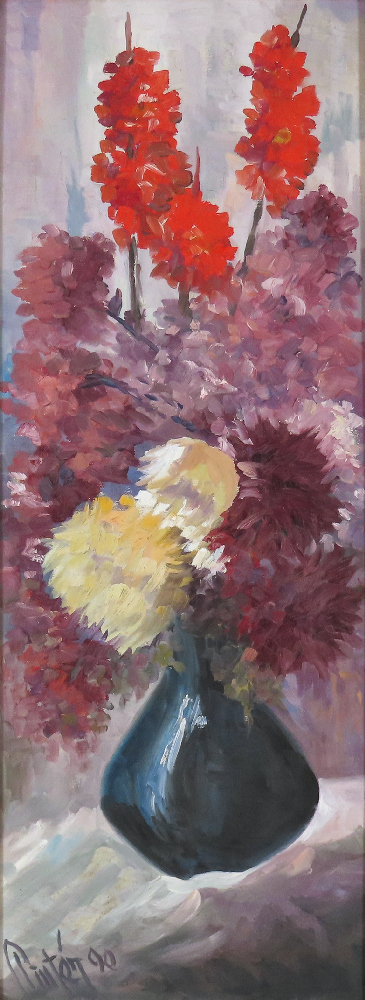 Názov diela: Kvety vo váze Technika: olej na plátne Rok: 1990 Značenie: vpravo dole Rozmery: 110 x 40 cm