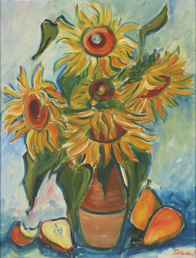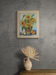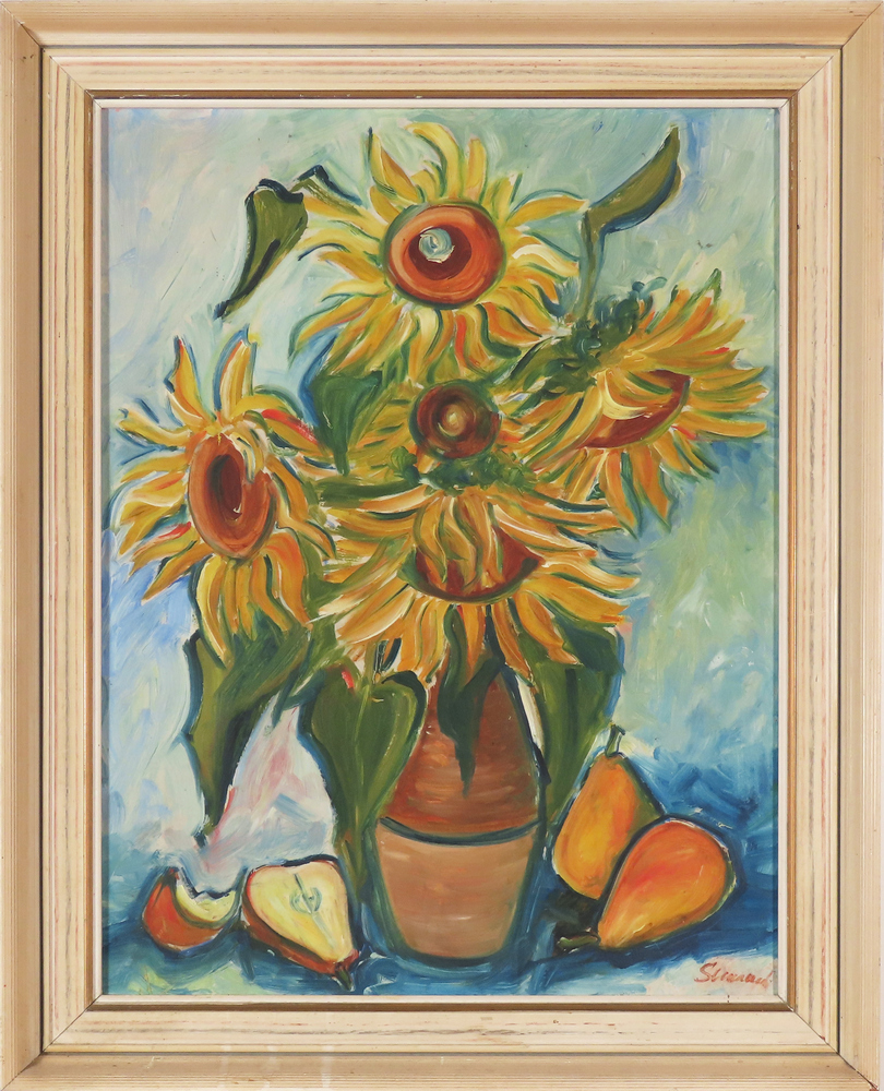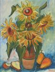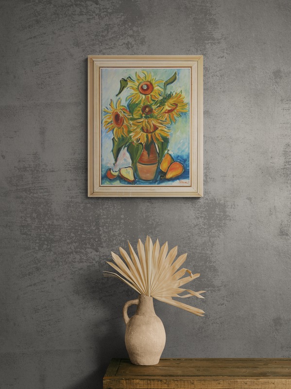 Názov diela: Slnečnice Technika: olej na sololite Značenie: vpravo dole Rozmery: 61 x 46 cm Rozmer diela s rámom: 72 x 57 cm