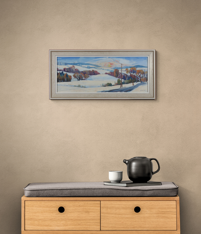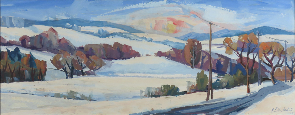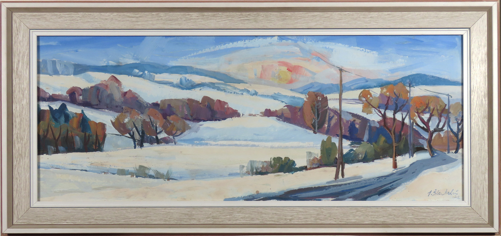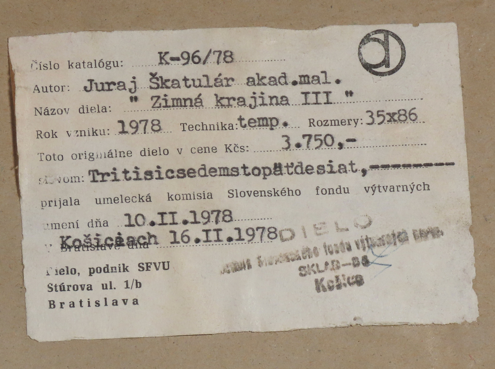 Názov diela: Zimná krajina Technika: tempera na papieri Značenie: vpravo dole Rozmery: 34 x 84 cm, s rámom: 48,5 x 98,5 cm
