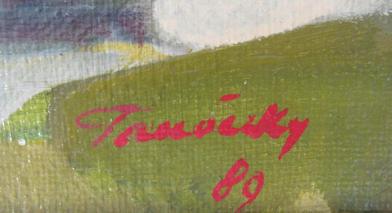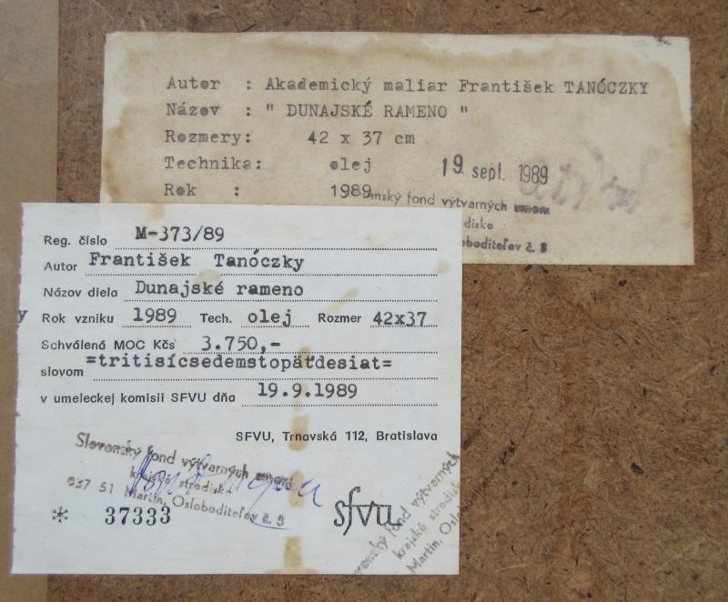 Značenie: vpravo dole "Tanóczky 89", zo zadnej strany diela autorský štítok, štítok SFVU