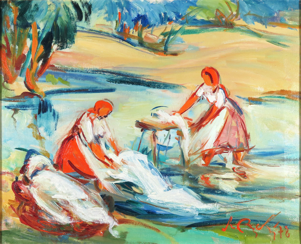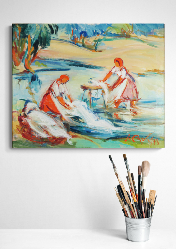 „Práčky“ od Mikuláša Rogovského predstavujú jednu z jeho najpôsobivejších žánrových scén z vyspelého obdobia 70. rokov. Autor tu naplno rozvinul svoje charakteristické výrazové prostriedky – dynamický ťah štetca, jasnú farebnosť a schopnosť premeniť každodenný vidiecky motív na maliarsky zážitok plný pohybu a svetla. Kompozícia pôsobí mimoriadne živo: trojica žien pracujúcich vo vode vytvára rytmus, ktorý nesie celý obraz. Energiu scénickej výstavby podčiarkujú výrazné akcenty červenej a modrej, zatiaľ čo pozadie so skratkovite modelovanou krajinou dodáva dielu sviežosť a letnú atmosféru. Práve táto kombinácia harmonickej farebnosti a spontánneho prejavu patrí k tomu najlepšiemu, čo Rogovský vo figurálnej žánrovej tvorbe dosahoval. Dielo pôsobí esteticky atraktívne, dekoratívne a pritom zostáva maliarsky hodnotné. Ide o obraz, ktorý má široký zberateľský potenciál – je dobre čitateľný, vizuálne príťažlivý a reprezentatívny pre autorovu tvorbu.