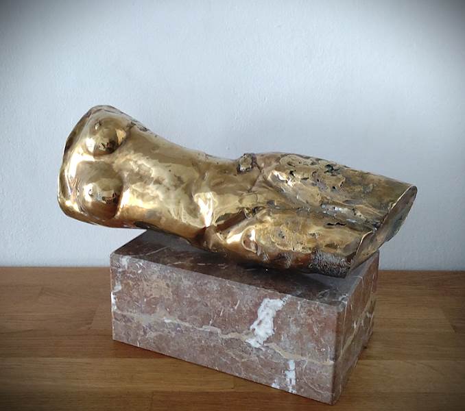 Karel Hronek – Akt Rok: 20. storočie Technika: Bronz (kamenný podstavec) Rozmer: 23 cm výška x 38 cm šírka x 15 cm hĺbka (11 kg) Značenie: Neznačené Popis: Mosadz, mramorový podstavec.