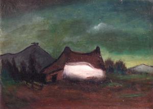 34 000 € - Krajina s kostolíkom, sýpkou a člnom.. Okolo 1951-54. Olej na kartóne. 26 x 41 cm.