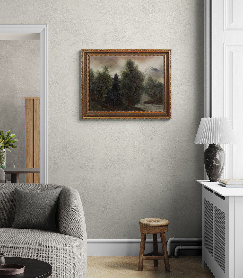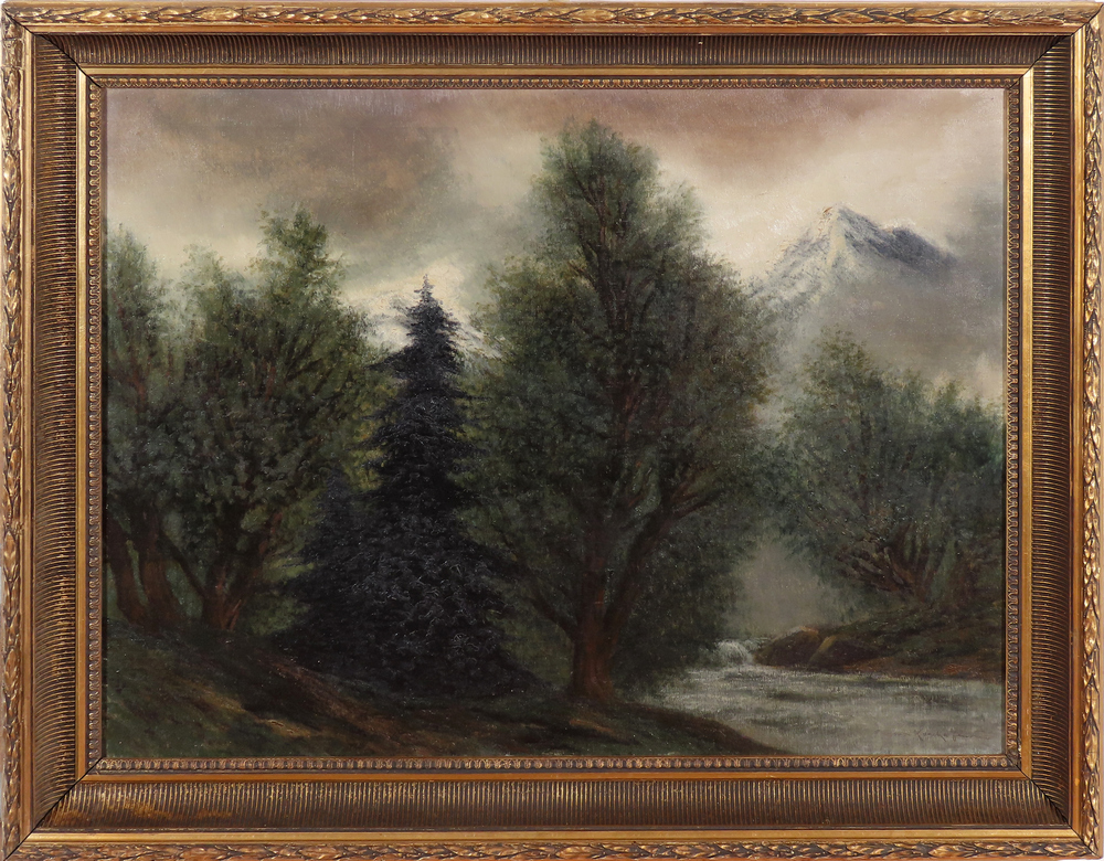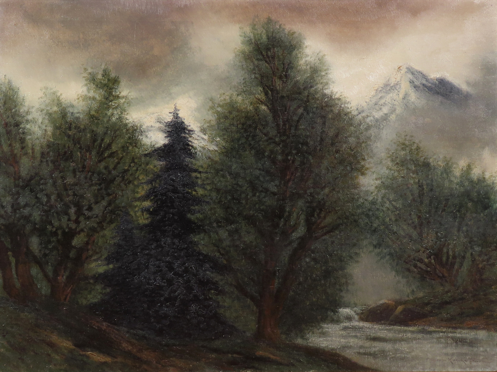 2 058,02 € - Pri rieke Poprad. Okolo 1910. Olej na plátne. 69 x 75 cm.