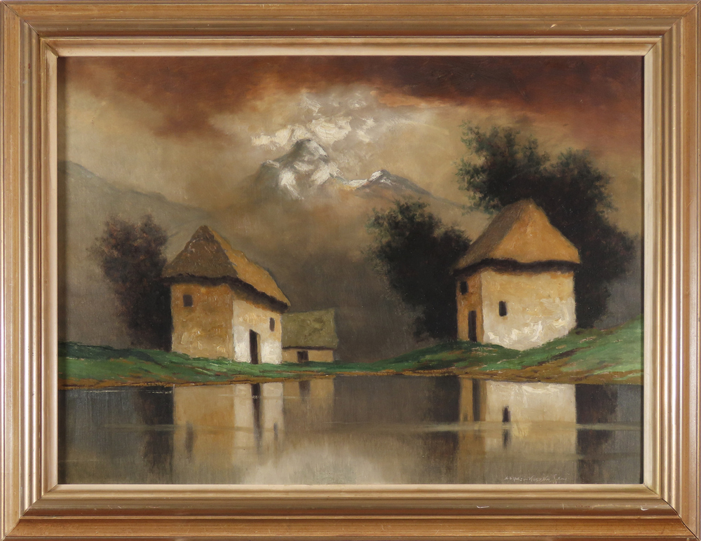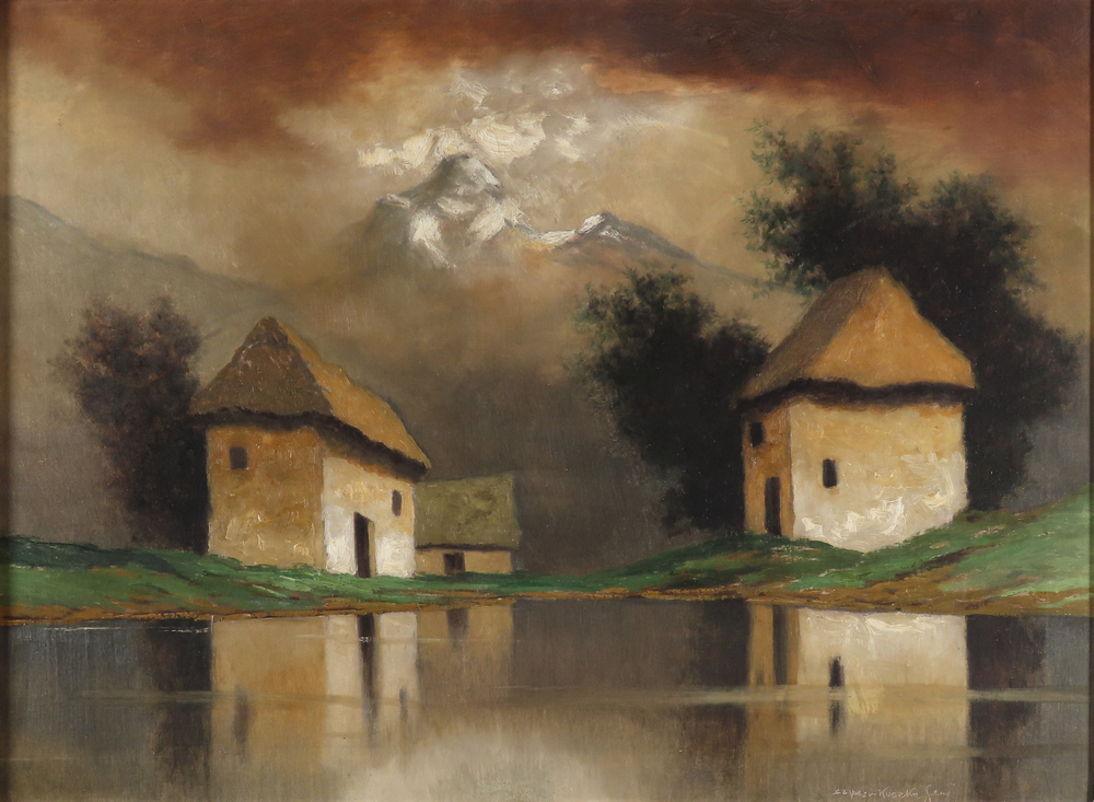 2 058,02 € - Pri rieke Poprad. Okolo 1910. Olej na plátne. 69 x 75 cm.