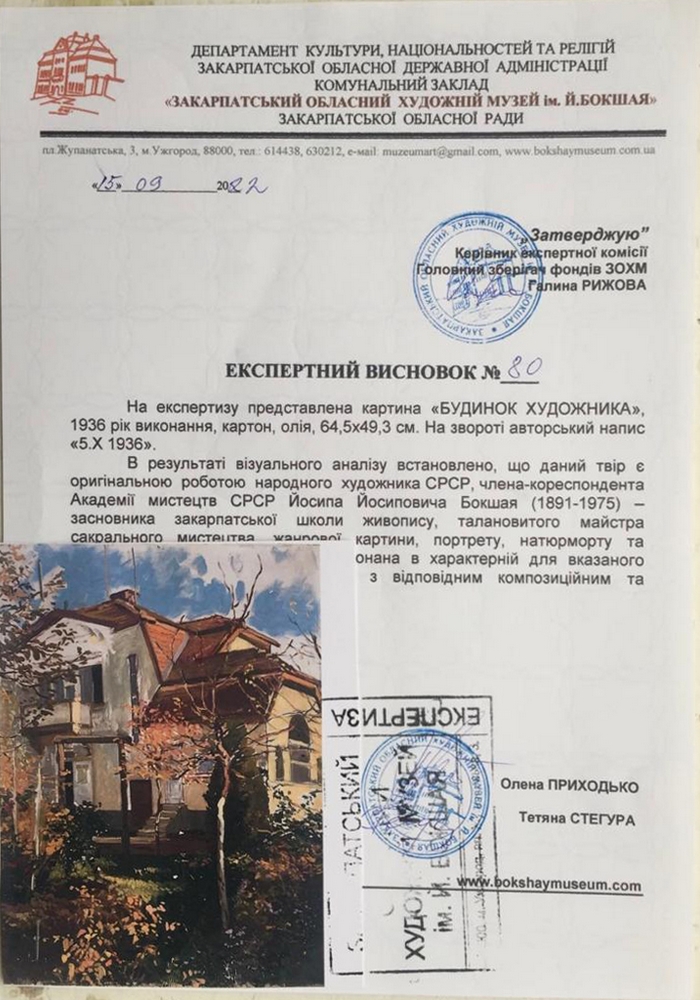 K dielu je doložený certifikát originality z múzea J. Bokšaya v Užhorode.