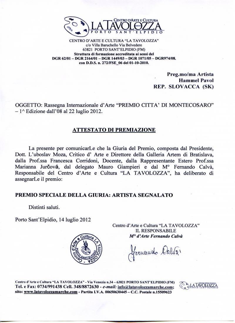 Pozn.: Dielo pochádza z ucelenej výstavnej kolekcie 22 olejomalieb Pavla Hammela, ktoré boli v roku 2011 úspešne vystavované v Oravskej galérii v Dolnom Kubíne ( jún- september ) a v Šarišskej galérii v Prešove ( september- november ). Dielo je aj publikované vo výstavných katalógoch oboch galérii. Pavol Hammel sa ako maliar zúčastňuje aj zahraničných prezentácií a súťaží. Napr. jeho diela boli zaradené aj v kolekcii diel na prestížnej . medzinárodnej výstave San Crispino, konanej v talianskom meste Porto Sant´Elpidio . Diela na výstave pozitívne zhodnotila aj medzinárodná komisia a medzinárodnou odbornou porotou mu bola udelená : „PREMIO SPECIALE DELLA CRITICA “ . ( viď. foto 2 )