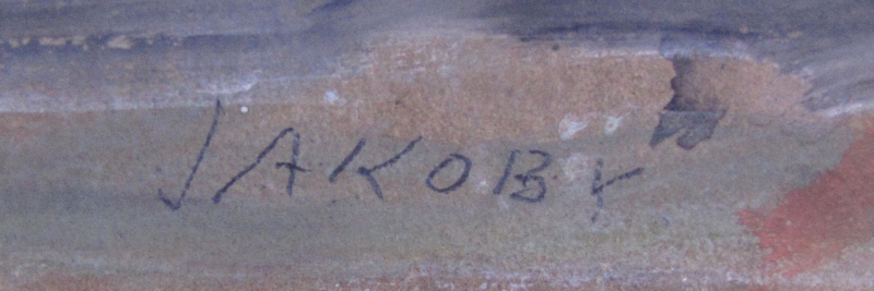 Vzadu štítok z výstavy. Aj v tomto diele sa tak trochu objavuje prebraný vplyv od Cézanna , odzrkadľujúci uvoľnenú farebnosť a slohovo nejasný kontrast odstupňovaných červených a zelených tónov v kontraste s čiernym prevedením stromov. Aj v tejto práci bádame jeho typické - takmer akvarelové rozmývanie olejovej farby pri stvárnení pozadia, ale aj ostré farebné obrysové ťahy jemným štetcom, ktoré sú jeho sprievodným identifikačným prvkom v každej olejomaľbe. Aj zmyselne zapustené signo autora v dolnom pravom rohu vzbudzuje skôr dojem spolupatričnosti k dielu. Jakoby bol zmyselný hedonista. Jeho maliarsky naturel je blízky Bonnardovmu, ale čiastočne i Matissovmu a Chagallovmu. Ťažko slovne vyjadriť onú mimovoľnú deformovanosť vecí a ľudí, onú neviazanú a „nešikovnú“ náčrtovosť, či farebnú škvrnitosť a fľakovitosť, ktorá často býva výsledkom nedisciplinovaného prednesu a pôsobí až dojmom zanedbanosti obrazu. Zároveň však v týchto obrazoch cítiť svojbytnosť výtvarného temperamentu a názoru, cítiť tu úprimnosť, nefalšovanosť a úplnú spontánnosť v plynutí maliarových predstáv a maliarovej ruky. Vidno aj to, že Jakoby pozná problémy modernej maľby a vie, že najvyšším zákonom umelca je vyjadrovať novosť poznania skutočnosti novou maliarskou formou. Preto sa nebojí byť novátorom; jeho novátorstvo spočíva v tom, že dal uvedomelý priechod svojmu naturelu a tým dosiahol v svojich obrazoch jednotu rozumového a bezprostredného.