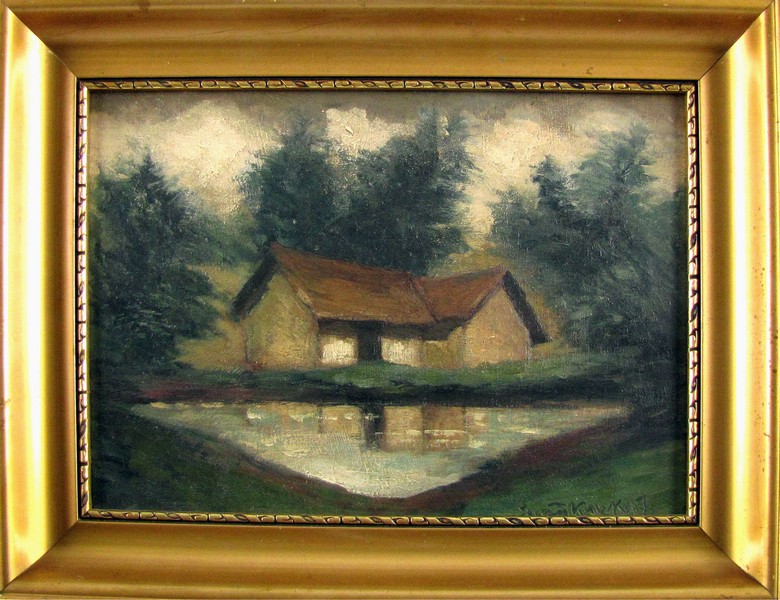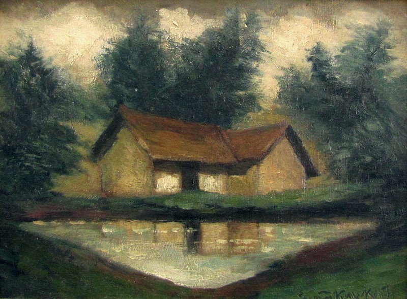 2 058,02 € - Pri rieke Poprad. Okolo 1910. Olej na plátne. 69 x 75 cm.
