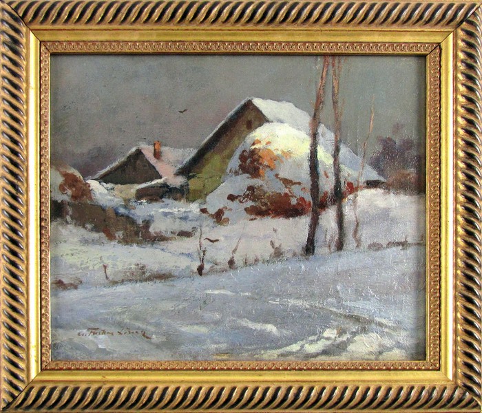 Dielo je vpravo dole poškodené. Vyžaduje si reštaurátorský zásah. Dielo je rámované.