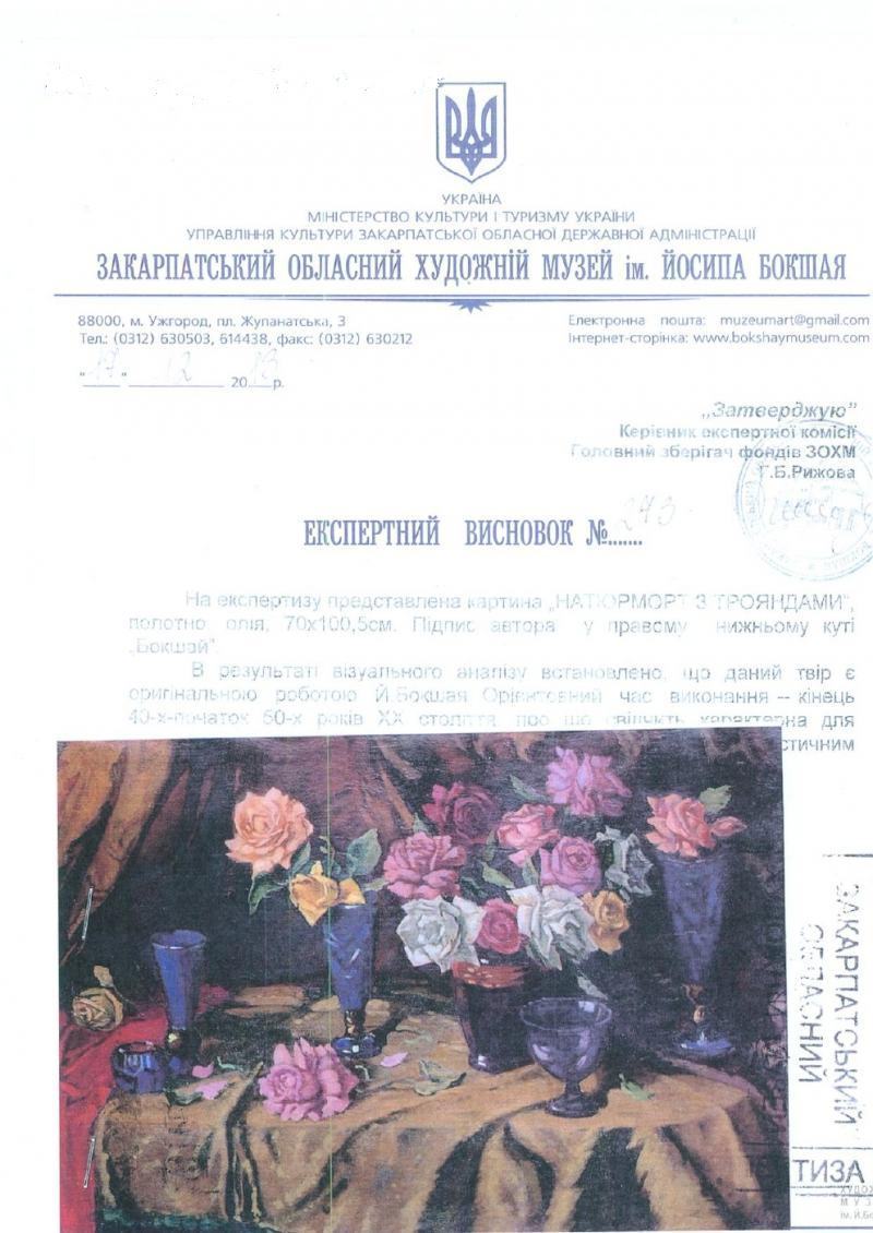 K dielu je dodaný znalecký posudok z múzea Jozefa Bokšaya v Užhorode. (vid.foto)