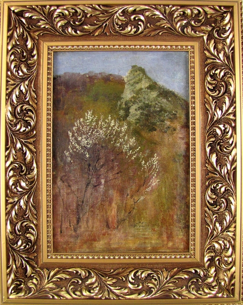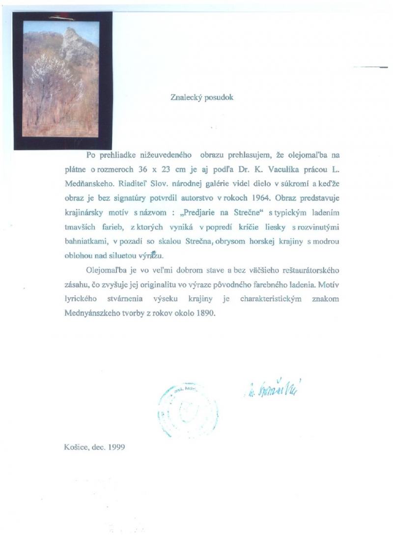 Ponúkané dielo L. Mednyánszkeho „ Predjarie pod Strečnom“ predstavuje typický krajinársky námet jeho tvorby, kompozične zachytávajúci krajinársky námet s motívom skaly a stromu. Mednyánszky sa často práve v období okolo roku 1900 venuje témam skál, riečnych alebo potočných brehov, ktoré sú lemované stromami a kríkmi. Ojedinelé v nich umiestňuje aj figúry, ktoré sú ale často v úlohe len doplnku témy, keďže ide hlavne o rybárov alebo práčky. V prípade ponúkaného obrazu rozvrhol Mednyánszky kompozíciu na dva plány, pričom do predného umiestnil skoro centrálne rozkvitnutý strom , a do zadného dominujúcu skalu.. V pozadí maliar ponecháva priestor na časť oblohy, ktorá dotvára dojem nálady celej kompozície. Jeho maliarsky rukopis je uvoľnený, na obraze sú viditeľné rýchle ťahy štetcom. Podľa Karola Vaculíka maliarovo posolstvo bolo odkazom ”… jedného z najväčších umelcov, akých toto skromné, vtedy vrchovato ubité prostredie dalo svetu… Bolo to výsostne výtvarne transponované posolstvo sociálneho i umeleckého reformátora, svetobežníka, umelca nadnárodného, človeka bez vlasti a predsa bytosti hlboko zakorenenej vo svojom rodnom kraji, v prostredí svojho detstva, mužných liet a najmä trvalých návratov. Napriek častým pobytom vo svete a priam horúčkovitému presúvaniu sa z miesta na miesto Mednyánszky sa nikdy neodcudzil prostrediu, krajine, z ktorej vyšiel. Bol k nej viazaný pevnými, nerozlučnými putami vzťahov a väzieb. Slovensko a slovenská krajina, ale aj jej ľud boli pri výtvarnom hľadaní vždy určujúcim, podnecujúcim korektívom. Okrem študijných pobytov nebolo roku, aby sa s inštinktom sťahovavého vtáka nebol permanentne vracal na bezpečnú, uspokojujúcu podstatu svojej materskej a otcovskej základne. Ba vlastne ani nešlo o návraty, ale iba o časté púte nepokojného ahasvera … Nebolo v minulosti okrem neho u nás umelca, ktorý by tak mnohostranne a s takou láskou ospieval slovenskú krajinu a jej ľud. Vo všetkých jej podobách a v najrozličnejších situáciách. Okolie Beckova, ale najmä podtatranských Strážok, krás Spiša, Zemplína, Šariša, ale aj iných končín Slovenska…”. Na dnešný vkus trochu patetické vety. Čo je však ešte závažnejšie, nejestvuje v tomto a ani iných Vaculíkových textoch jediné spresňujúce zistenie v čom vlastne spočívala adresnosť Mednyánszskeho slovenských krajín, čo ich odlišovalo, od obdobných (rovnako početných) maďarských, francúzskych, či talianskych sujetov? Azda “ospieval” Mednyánszky neslovenské plenéry inak, alebo z akéhosi viditeľného a popísateľného odstupu, či s menším umeleckým zaujatím? Takéto úvahy sú samozrejme nezmyselné. Sám Vaculík napokon na iných miestach svojho textu veľmi precízne sleduje vývin Mednyánszkeho krajinárskeho slohu od mníchovského naturalizmu až k barbizonskému zvnútorneniu výseku prírody. Skrátka – i podľa Karola Vaculíka – pre Mednyánszkeho nepredstavovala krajina kultúrny fenomén, ale metafyzickú záhadu, nehľadal v nej typické príznaky génia loci, bola mu skôr ozvučnou doskou vlastného, subjektívneho duševného rozpoloženia, priestorom pre filozofujúcu meditáciu.( Zdroj: Malonyay, D.: Mednyánszky. Budapešť 1905; Kállai, E.: Mednyánszky László. Budapešť 1943; Vámošiová, S.: Slovenská krajina v diele Ladislava Mednyánszkeho. In: Z novších výtvarných dejín Slovenska. Bratislava 1962, s. 39--146; http://www.soga.sk/aukcie-obrazy-diela-umenie-starozitnosti/aukcie/119-vecerna-aukcia/mednyanszky-ladislav-sumracna-krajina... )