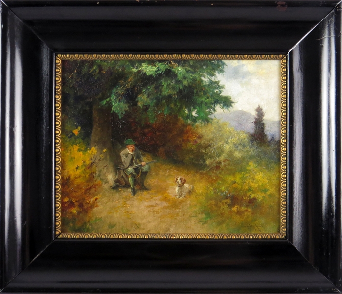 95 000 Sk - Zimná krajina (Poľovačka). Okolo 1905. Olejová tempera na papieri, 47x68 cm.
