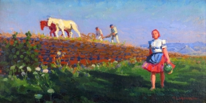 Dielo spracováva tému prác na poli – obrazovej ploche dominuje v popredí vpravo postava mladej ženy v bielej blúzke, v červenej sukni s modrou zásterou a v červenej šatke, kráčajúcej po zelenej lúke a nesúcej v ľavej ruke zelený keramický džbán na vodu. V kompozičnej diagonále smerujúcej od kríka v ľavej časti obrazovej plochy k ženskej figúre lemujú lúku rozkvitnuté biele a modré kvety vymedzujúce pooranú časť mierneho svahu v strednom pláne. Vo vrchole svahu sa oproti výraznému pozadiu oblohy vynímajú postavy dvoch mužov v bielom, s klobúkmi na hlavách orajúcich s dvoma koňmi. V poslednom pláne obrazovej plochy sa za svahom a postavou ženy zjavuje v diaľke vpravo modrastá kopcovitá krajina Zemplína.