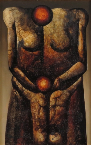 9 200 € - Ikona IV. 1991. Olej, kombinácia techník na preglejke. 61 x 46 cm.