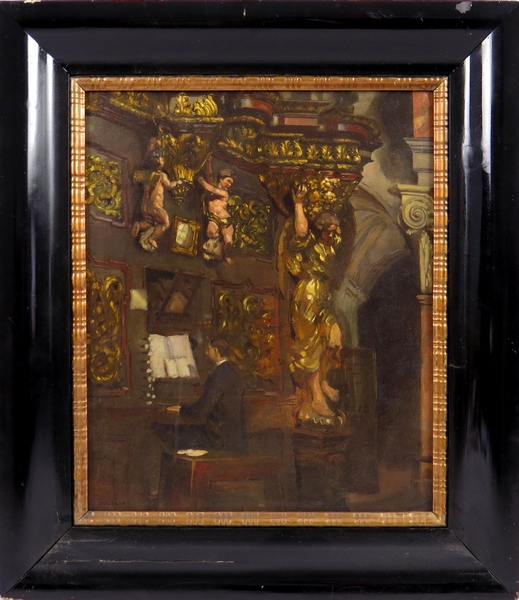 Prítmie chrámového interiéru rozjasneného len odbleskami bohatého zláteného ornamentu starobylého organu sa stalo vďačným námetom diela českého umelca Josefa Multrusa. Autor s obľubou jemu vlastnou využíva temnejšiu hnedastú stupnicu farieb. Drobná postava hudobníka splýva s členitou organovou skriňou. Autor stavia do kontrastu útlu postavu organistu a grandióznosť monumentálneho organu, ktorý ožíva pod rukami skromného mladíka. Josef Multrus sa stal uznávaným maliarom žánrov a sociálnych námetov, no v ponúkanom diele je mu figúra snáď len zámienkou pre zachytenie zložitej dekoratívnej výzdoby kráľovského hudobného nástroja.