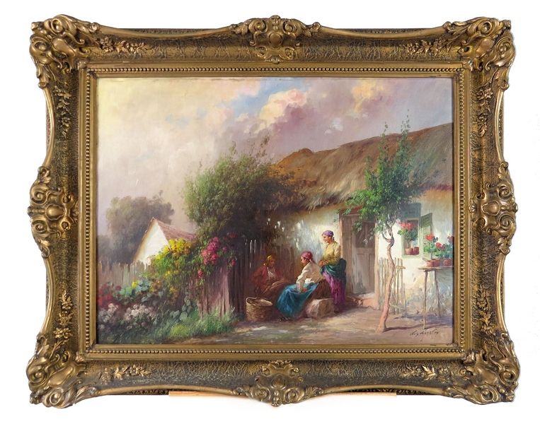 54 000,- Sk Nedeľné popoludnie na dedine. Okolo 1920. Olej na plátne. 61 x 80 cm. (63. jarná aukcia, 28.3. 2006)