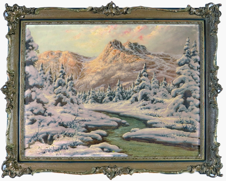 110 000 Sk - Zima v Tatrách. Okolo 1930. Olej na plátne. 70 x 119 cm. 110 000 Sk - Zimný potok. Okolo 1930. Olej na plátne. 60 x 83 cm. 94 000 Sk - Potok v zime. Okolo 1930. Olej na plátne. 59 x 80 cm