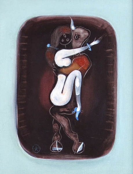 Jeden zo zakladajúcich protagonistov Skupiny Mikuláša Galandu Vladimír Kompánek sa k maliarstvu dostal v neskoršom období svojej tvorby. Umelecký svetonázor rajeckého majstra formovali domáce kultúrne archetypy i symboly a zároveň výsostne moderné výtvarné prejavy. Ponúkaná metaforická variácia na tému „kráska a zviera“ predstavuje nežnú poetickú stránku vzťahu muža v jeho divokosti a ženy ako nádhernej zvodkyne. Ladné línie ženského tela náruživo objímaného únoscom, rovnováha ostrých línií a hebkej žiarivosti plných tvarov i celková mäkkosť šikovne komponovaného výjavu podporujú prívetivosť zobrazenia starej mýtickej rozprávky. Pochopenie motívu eskaluje v hravo dráždivej predstave umelca a jeho modelky.
