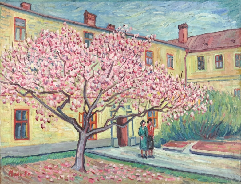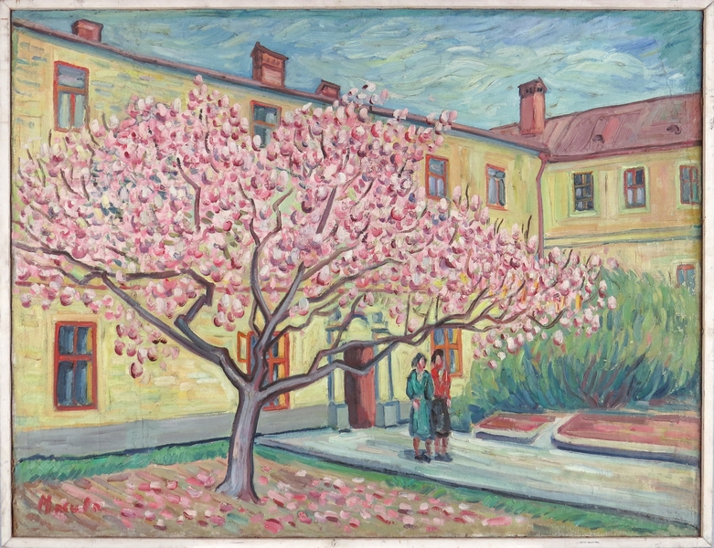 Programovo umiernenejšia tvorba Tibora Maculu v prevažnej miere sprostredkúva príjemnú náladu zákutí Banskej Bystrice. V predstavenom diele poukazuje na nádheru zakvitnutej magnólie na nádvorí Diecézneho centra Jána Pavla II. na Kapitulskej ulici. Emotívny svietivý kolorit naznačuje, že umelcovi išlo o výtvarné definovanie farebného senzuálneho zážitku. Formy stvárňuje drobnými i pozdĺžnejšími škvrnami, ktoré naznačujú maliarov zvýšený záujem o dekoratívne pôsobenie. Tvary ohraničil miestami hrubšou tmavou kontúrou. Dielo poukazuje na Maculov zmysel pre vyváženú kompozíciu a harmonické budovanie objemov.