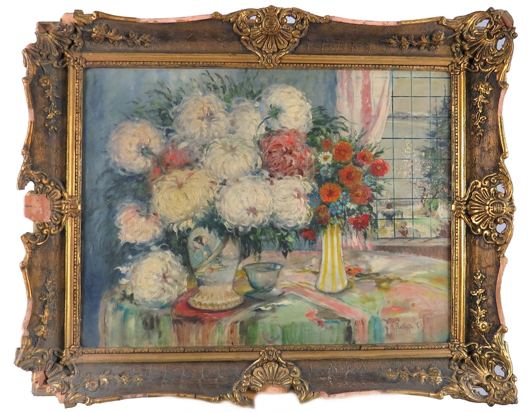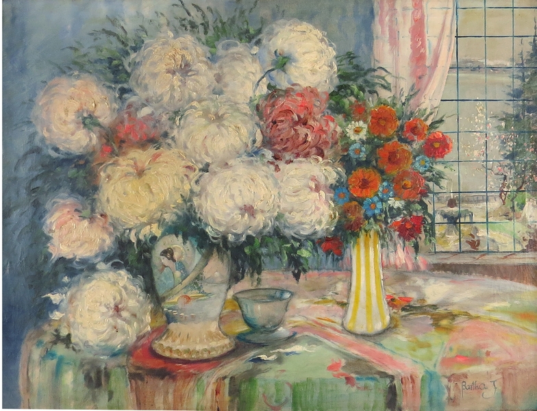 Súhra, či kontrast veľkostí, farieb, a tvarov kvetov vo vzťahu k sebe navzájom inšpirovali umelca k namaľovaniu predmetného diela. Vzhľadom na obsiahlosť a určitú texturálnu plnosť záberu je pre Barthu ťažiskom jednoduché a zrozumiteľné kompozičné rozostavenie komponentov obrazu. Maliar svoje zátišie doplnil pohľadom do jarnej záhrady s fontánou, pestrým obrusom a exotickým porcelánom – šálkou a vázou s postavou orientálky a ázijskou krajinou. Bartha zhodnocuje pozorovanú optickú predlohu, no pri snahe o ilúziu reálnych rastlín nezachádza do prílišnej popisnosti.