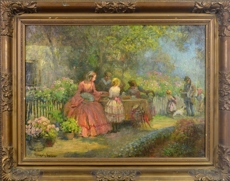 Roztomilá figurálna scéna odohrávajúca sa v zakvitnutej záhrade pred domom je dielom maďarského žánrového maliara Imreho Gergelyho. Akademicky vzdelaný a scestovaný autor zobrazuje mladé urodzené dámy dohliadajúce na deti počas letného slnečného dňa. Pri olovrante je veselá spoločnosť náhle vyrušená príchodom pocestného, ktorý deťom ponúka svoj tovar – pravdepodobne sladkosti alebo praclíky. Gergelyho sentimentálne zobrazenie podčiarkuje citovosť, zdôrazňuje príjemné stránky života a zdobnosťou i pestrou farbou potláča strohosť výtvarného prejavu.