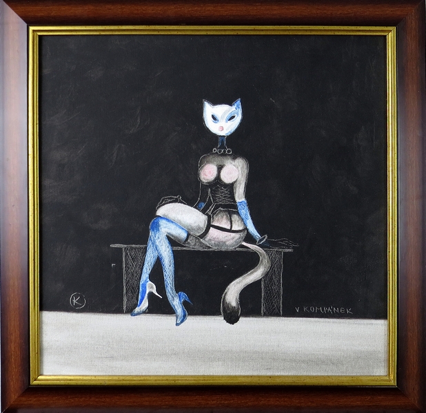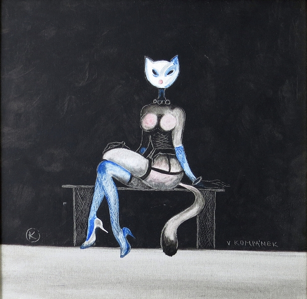 Na symboly, znaky a zoomorfné i antropomorfné motívy bohatá tvorba Vladimíra Kompánka sa radí k najšpecifickejším výtvarným prejavom druhej polovice 20. storočia na Slovensku. Jeho početné variácie na tému krásky sa v predstavenom diele zhmotnili do osobitej „kompánkovskej konfigurácie“ vyjadrujúcej v pravom slova zmysle umelcov výtvarný svetonázor, ktorý do veľkej miery spočíval v archetypoch tradičnej kultúry. Autor na obľúbený motív nahliada v súvislosti s inšpiráciou personifikujúcou povahu ženy a mačky. Zvodná elegancia, vábivosť a rafinovanosť oboch bytostí sa tak snúbi aj v ponímaní umenia ľudového s moderným.