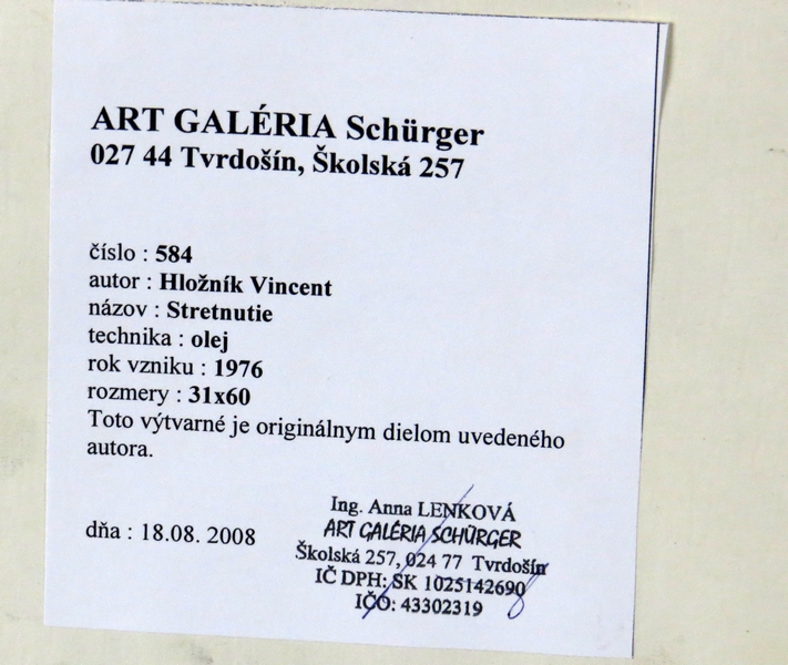 Vincent Hložník bol čelným predstaviteľom druhej fázy výtvarnej moderny na Slovensku. Jeho nadrealistické apokalyptické vízie sú vyjadrením celoživotného záujmu o spodobnenie ľudskej existencie s ohľadom na princípy humanizmu a etiky. Nezmerná energia a odvážna expresívnosť ho odlišovali od väčšiny vrstovníkov tvoriacich v jeho blízkosti. Dielo Stretnutie vypovedá o prieniku skutočného s ireálnym a zároveň komunikuje aktuálnu situáciu naplnenú utrpením, násilím a konfliktmi. Autorova výpoveď si nezakladá na popisnosti, čím sa uvoľňuje k ešte väčšej intenzite a duchovnej hĺbke.