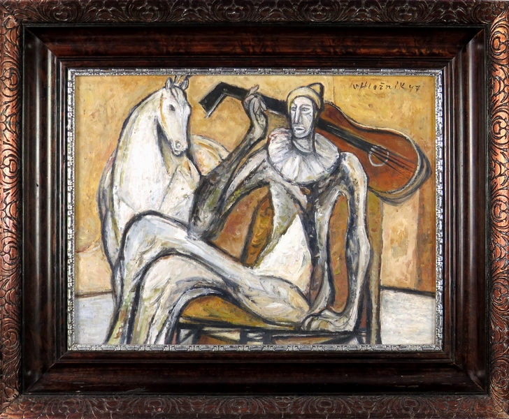 Výnimočný maliar, grafik a ilustrátor Vincent Hložník sa s pravidelnosťou opieral o už klasický výtvarný motív života pod plachtami cirkusového šapitó. Pieroti, klauni, artistky i šašovia neraz sprevádzaní robustnými postavami koňov sú v jeho obrazoch vyjadrením osamotenosti, neistoty, smútku až tragédie. Radosť i zármutky cirkusantov Hložník spoznával osobne už počas štúdia v Čechách, kde mal možnosť pozorovať týchto umelcov v okolnostiach ťaživých vojnových rokov. Negatívne emócie zračiace sa v jeho dielach sa tak stali vyústením konfliktu medzi vonkajšou realitou sveta a skrytými hĺbkami duše jednotlivca.