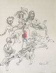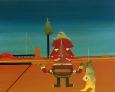 77 000 Sk - Uchopiteľ snov rozkročený naširoko II. Okolo 1980. Olej na preglejke. 117 x 84 cm.