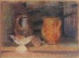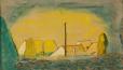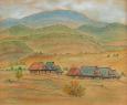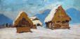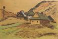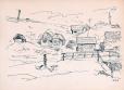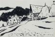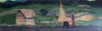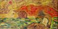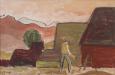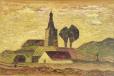 34 000 € - Krajina s kostolíkom, sýpkou a člnom.. Okolo 1951-54. Olej na kartóne. 26 x 41 cm.