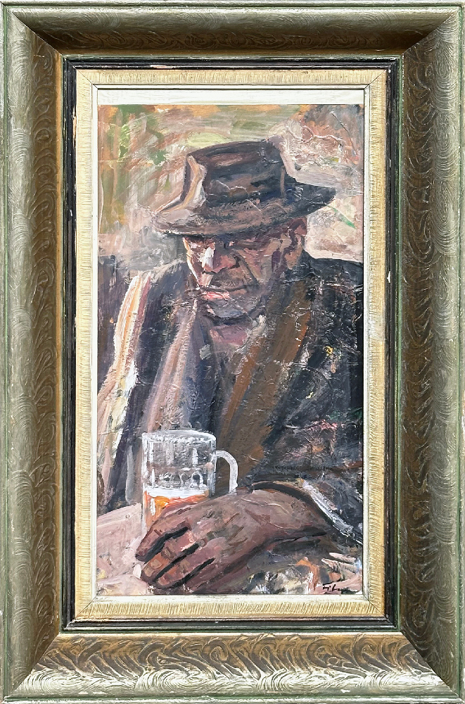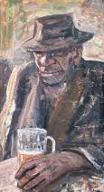 Košický maliar Štefan Filep sa narodil 10. novembra 1954 v Poľanoch pri Trebišove. Prvé odborné výtvarné skúsenosti získal na súkromných hodinách u majstra Ľ. Felda. Vyštudoval Vysokú školu výtvarného umenia v Bratislave pod vedením doc. G. Balažovičovej a doc. F. Stoklasa. V roku 1980 získal Cenu SFVU za maľbu. V roku 1983 sa vrátil do Košíc, kde žije a tvorí dodnes. Ústredným motívom ponúkaného diela je podobizeň muža v Krčme. Autor v maľbe vyjadruje napätie medzi vonkajším zjavom a skrytými duchovnými stránkami osobnosti, ktoré akcentuje formálnou úpravou diela. Štefan Filep do svojich obrazov vkladá množstvo symbolov a odkazov s hlbokým filozofickým podtextom, pričom od diváka nevyžaduje ich komplexné pochopenie. Podobizeň človeka bola obľúbeným motívom predovšetkým skoršej autorovej tvorby. V súčasnosti je skôr výnimočným námetom, pričom pozornosť umelca momentálne zaujalo objavovanie nových vyjadrovacích prostriedkov.