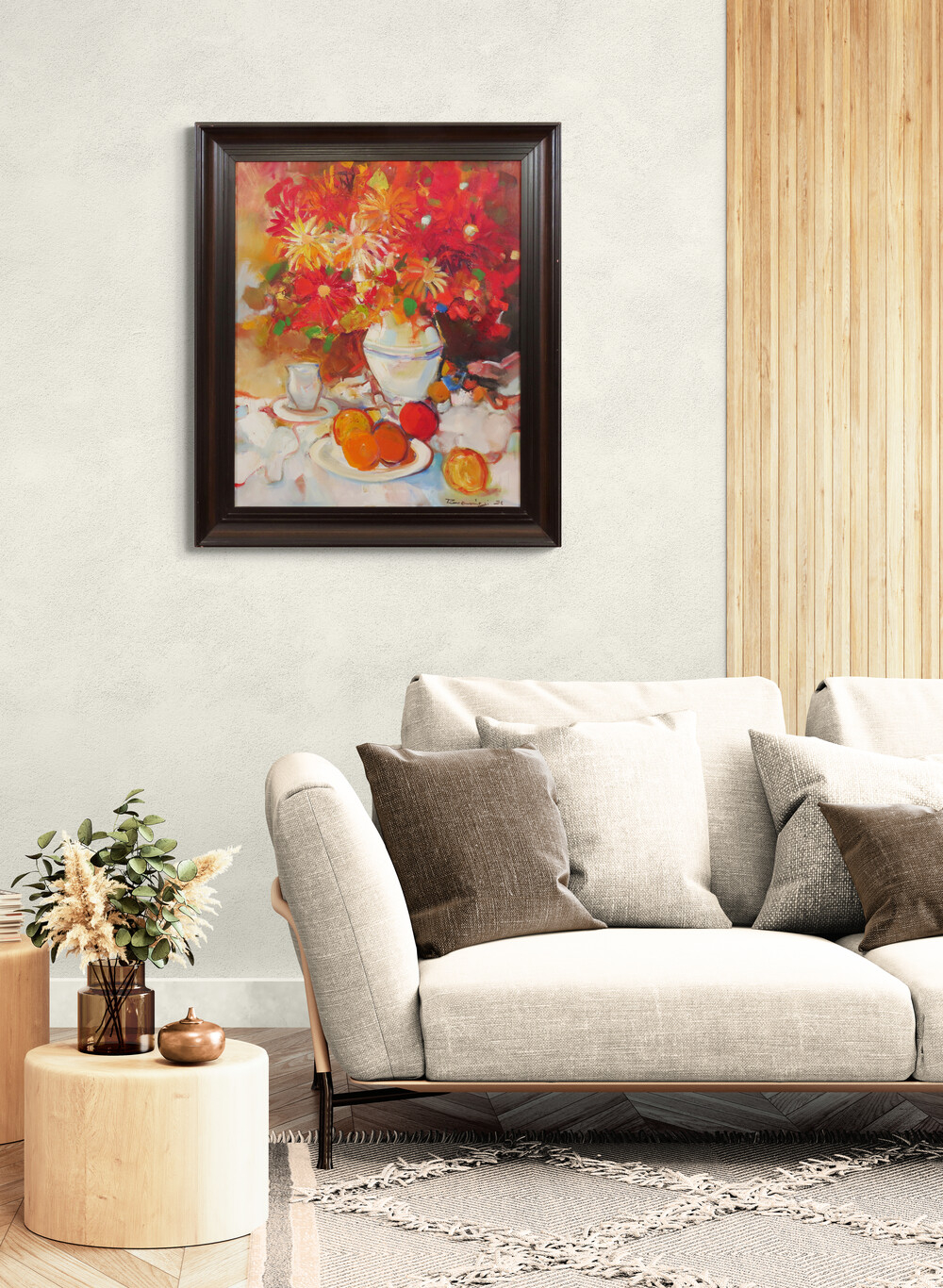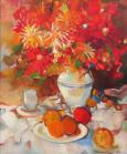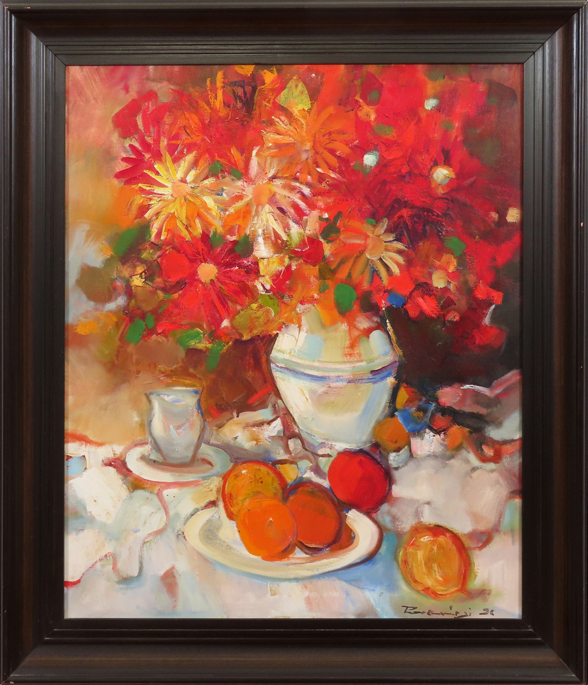 Farebne bohaté zátišie s kvetmi predstavuje jeden z obľúbených námetov tvorby Štefana Roskoványiho. Autor tu využíva klasickú kompozíciu zátišia – kyticu vo váze doplnenú o ovocie a stolové predmety – ktorú však interpretuje voľným a energickým maliarskym rukopisom. Výrazná farebnosť červených, oranžových a žltých tónov kvetov vytvára dominantný vizuálny akcent celej kompozície.